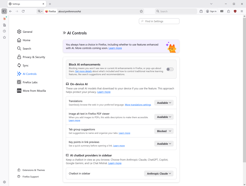 Probably the main feature of Firefox 148.0 is the new AI controls that Mozilla added to the browser. Load about:preferences#ai in the browser’s address bar or go to Menu > Settings > AI Controls to display all options.