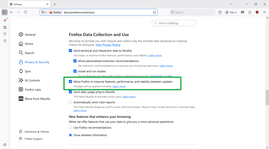 - Uncheck “Allow Firefox to improve features, performance, and stability between updates”.